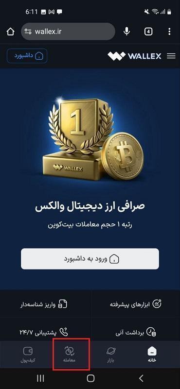 ۱) برای فروش COINX به صورت آنی، در صفحه اصلی والکس، روی تب «معامله» کلیک کنید.