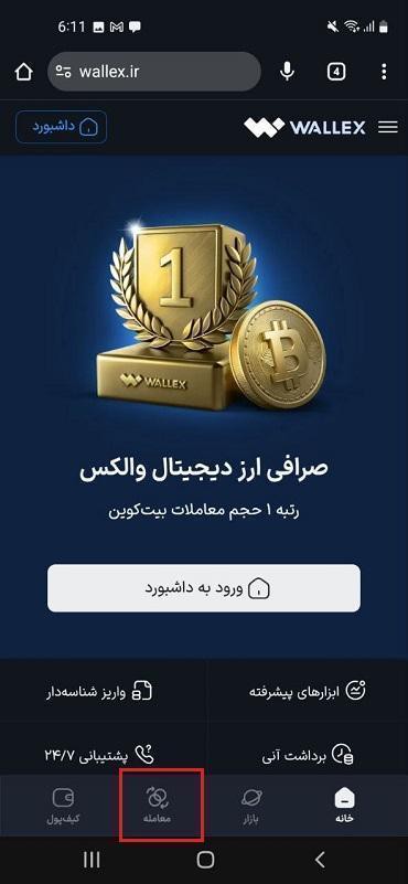 ۱) برای خرید گیگل فاند به صورت آنی، در صفحه اصلی صرافی ارز دیجیتال والکس، روی تب «معامله» کلیک کنید.